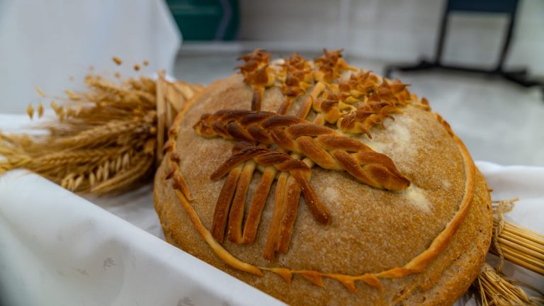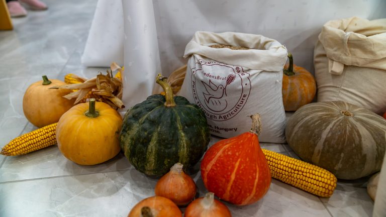Pfarrer Zsolt Lázár begrüßt, gemeinsam mit seinem Kollegen, die lokalen und internationalen Gäste. Er unterstreicht die symbolische Rolle des Brotes als Verbindung zwischen Landwirtschaft, Ernährungssicherheit und Frieden in Europa und weltweit. Zsolt Lázár begleitet das FriedensBrot-Projekt von Anfang an. Einige Teilnehmende im Raum erinnern sich noch gern daran, daß der pastorale Menschenfreund bereits im September 2016, zur 3. Jahreskonferenz des FriedensBrot-Netzwerkes, Gäste und Freunde aus den Partnerländern an diesem besonderen Ort begrüßte. Damals wie heute zelebriert er einen ökumenischen Gottesdienst.