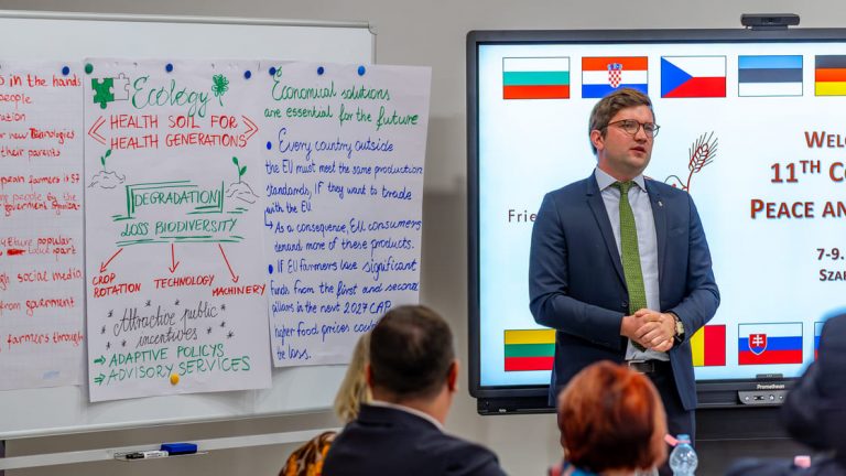 Im September 2016 trafen sich Vertreter des Internationalen Netzwerkes „Frieden und Landwirtschaft“ zu ihrer 3. Jahreskonferenz schon einmal im ungarischen Szarvas. Nun, zum zweiten Mal an diesem Ort, läutete die 11. Europäische Jahreskonferenz vom 7. bis 9. Oktober 2025 eine „neue Dekade“ des Dialogs und der Verständigung unter dem kraftvollen Symbol des Europäischen FriedensBrotes ein. Premiere feierte dort ein erstes „Sourdough Camp“ (SDC), mit dem das Netzwerk in Zukunft gezielt junge Menschen aus Landwirtschaf und ländlichen Räumen zur Diskussion aktueller Fragen zur Zukunft von Landwirtschaft und Frieden in der Europäischen Union ermutigen und einbinden will.