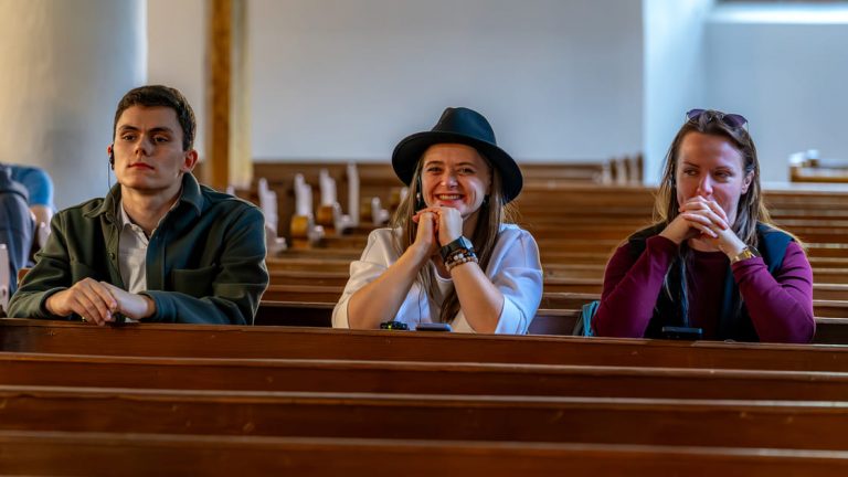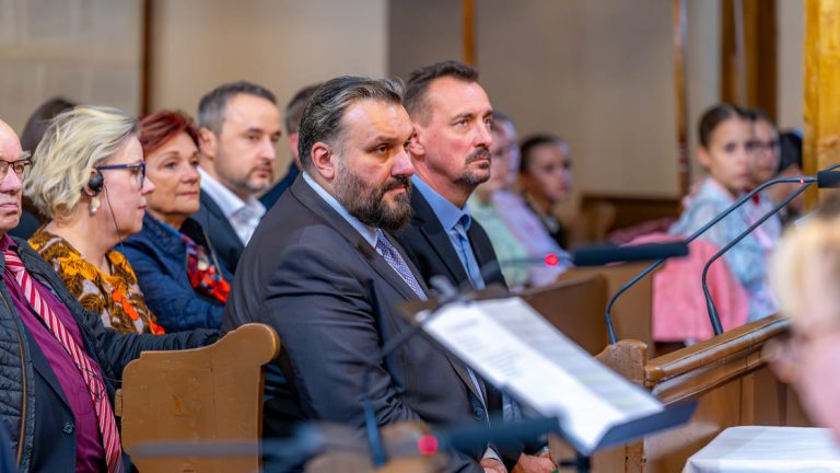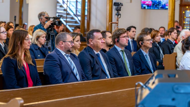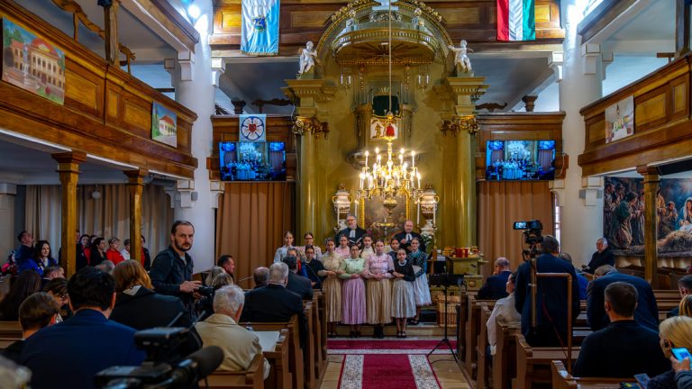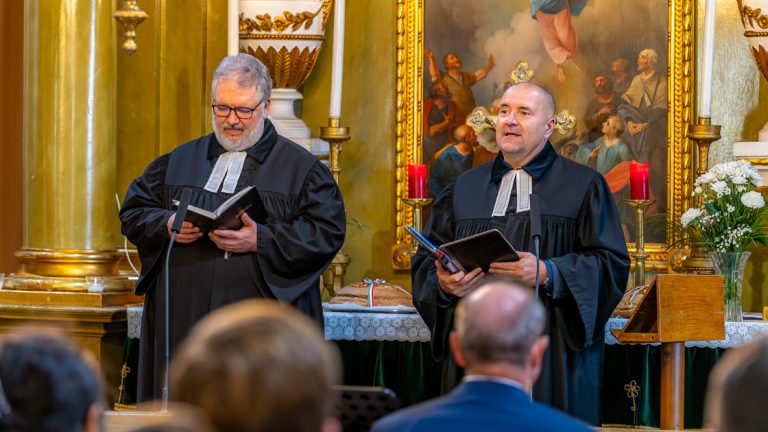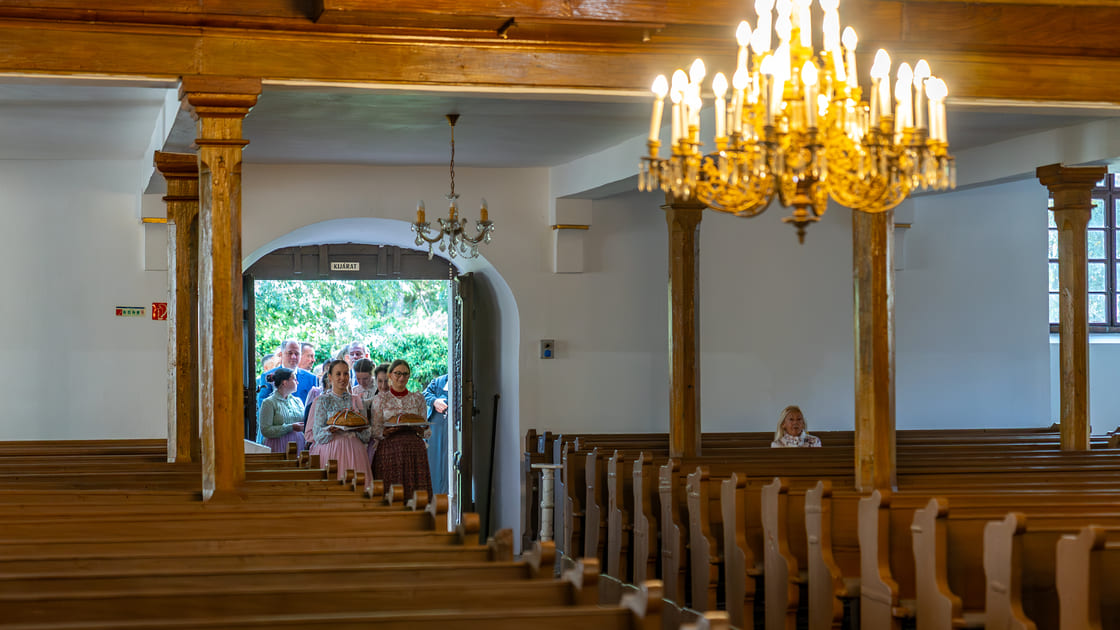 Der zeremonielle und emotionale Höhepunkt einer jeden FriedensBrot-Konferenz. Die Konferenzteilnehmenden erreichen die festlich geschmückte Lutherische Kirche in Szarvas. Musik begleitet Jugendliche, die das Europäische FriedensBrot des Jahres 2025 feierlich in die Kirche tragen. Der würdige Abschluss der 11. Jahreskonferenz des Internationalen Netzwerkes „Frieden und Landwirtschaft“ beginnt.