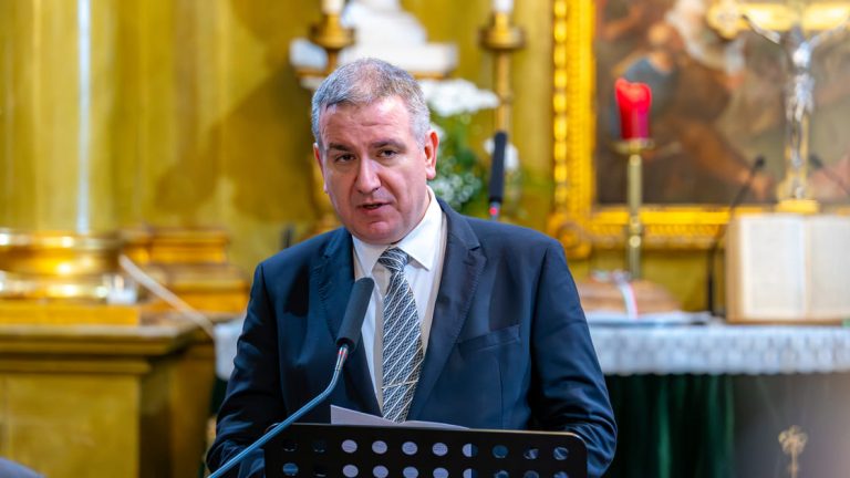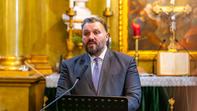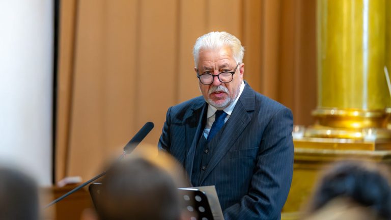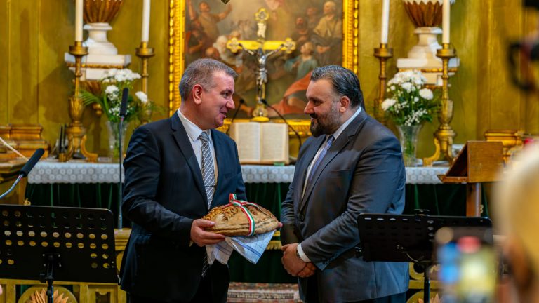 Geladene Gäste ergreifen das Wort: Frau Dr. Anna Miklós, Mitarbeiterin der Kirchengemeinde, Mr. Pal Hodalik, Bürgermeister von Szarvas und Dr. Gibfried Schenk, Mitglied des Vorstands des deutschen Vereins FriedensBrot e.V. In seiner Rede erinnert Schenk, Gründer der FriedensBrot-Idee, an die Geschichte Europas, an Zeiten von Krieg und Umbrüchen, in der Menschen aus den heute hier in Szarvas versammelten Partnerländern ihr Leben für die Freiheit gaben. Gemeinsam wurde 1989 der Eiserne Vorhang in Europa niedergerungen. Gemeinsam setzt man sich heute aber unter der Symbolik des Europäischen FriedensBrotes für einen gerechten Frieden in der Ukraine ein. Denn auch dort müssten die grundlegenden Überzeugungen der FriedensBrot-Gemeinschaft gelten: „Landwirtschaft braucht Frieden – Kein Frieden ohne Landwirtschaft“!